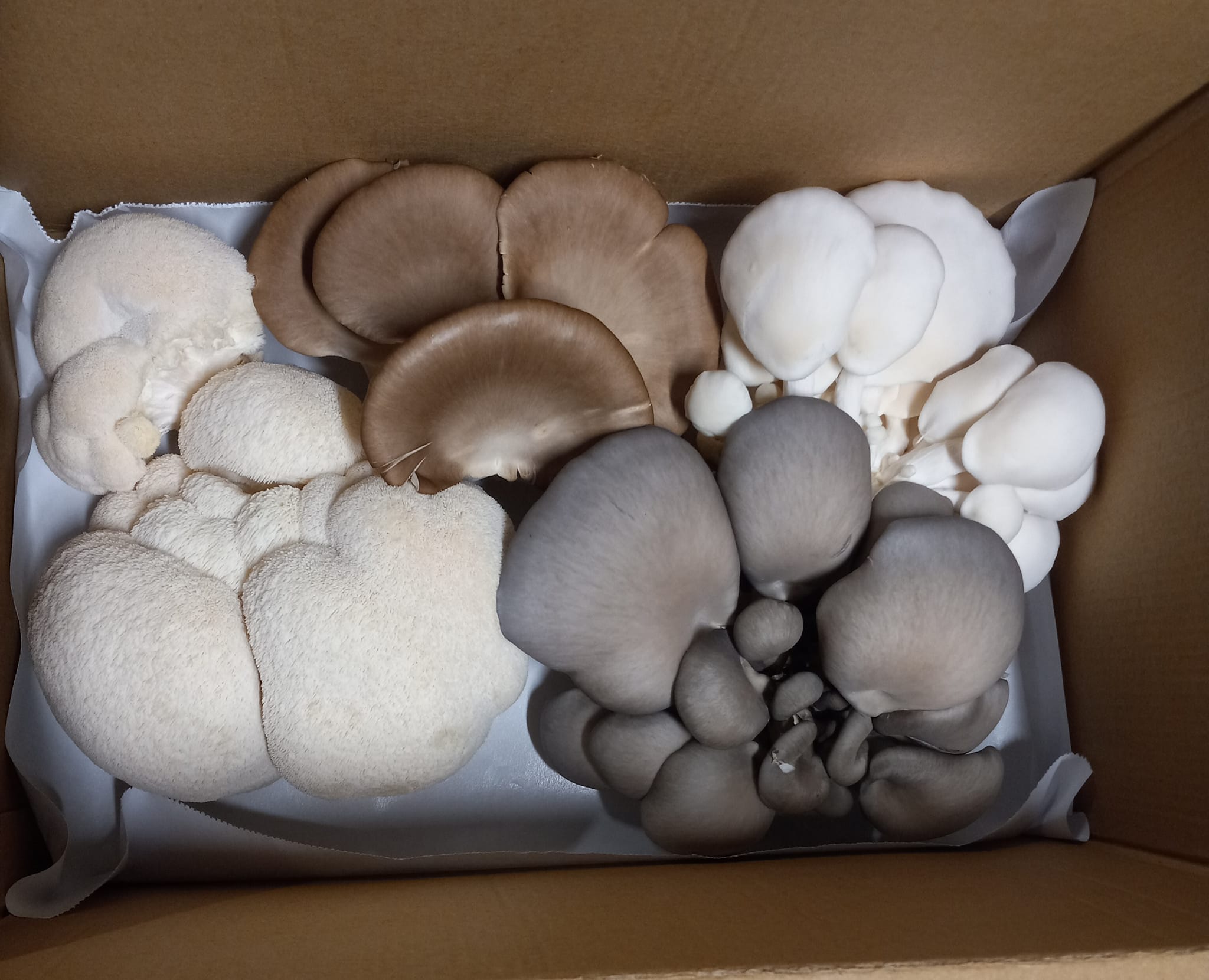 Home grown oyster, lion’s mane and chestnut mushrooms with other varieties! We start our mushrooms from cultures at our farm.
