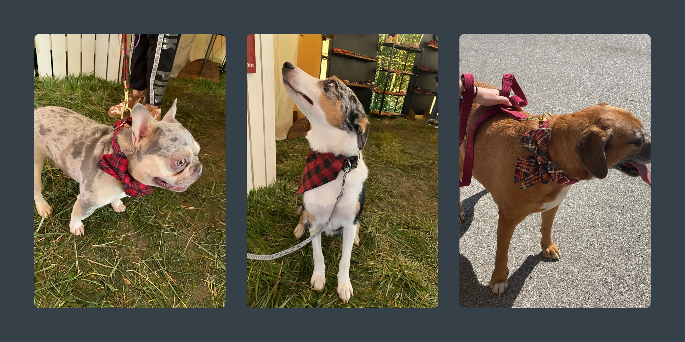 Handmade dog accessories, over-the-collar bandanas and bows, coordinating collars and leashes.